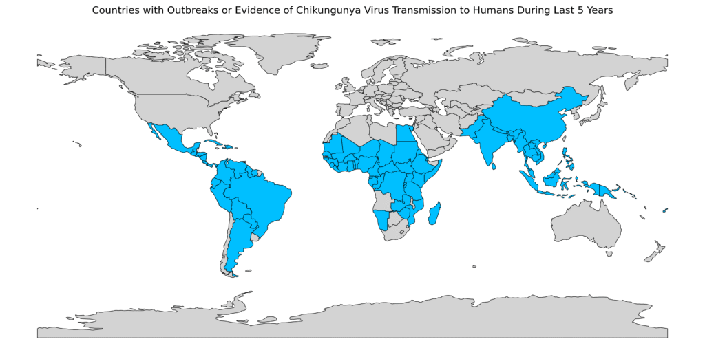 Many tropical and subtropical countries are at risk for chikungunya due to the presence of the Aedes mosquito. Owing to its wide geographic distribution, chikungunya infections have been reported in Africa, the Americas, Asia, Europe, and islands in the Indian and Pacific Oceans. Most outbreaks occur during the rainy season and cases typically decrease during the dry season.