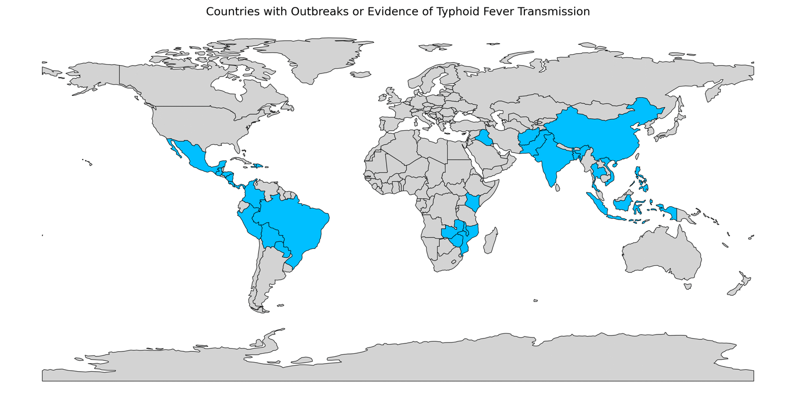 Typhoid fever is a bacterial infection caused by Salmonella Typhi, spread through contaminated food or water. Symptoms include prolonged fever, weakness, and abdominal pain. Affected countries include India, Pakistan, and Bangladesh.