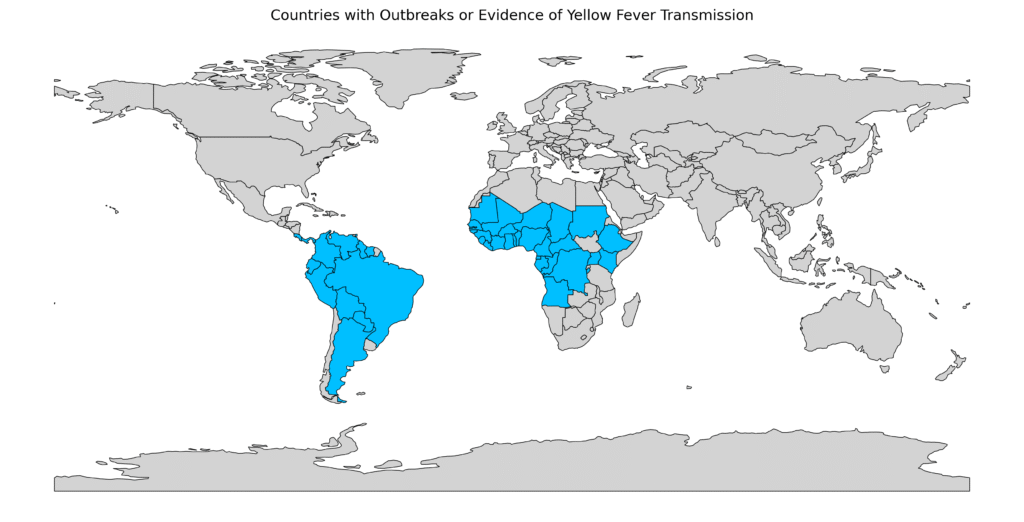 Yellow Fever transmission occurs in more than 40 countries across Africa, South America, and parts of Panama. These high-risk areas continue to experience outbreaks, making yellow fever prevention a global health priority. Many countries now mandate proof of a yellow fever vaccine for travelers aged 9 months and older. The World Health Organization (WHO) is actively working to eliminate yellow fever outbreaks through mass vaccination campaigns in the most affected regions. Be sure to consult with a travel health clinic before planning your trip to ensure you are protected.